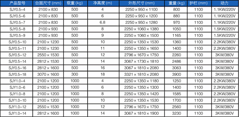 产品规格:根据升降高度分为4、6、8、10、 12、14、 16、 18米,系列产品载重300、 500公斤。其他载重需另外定做。